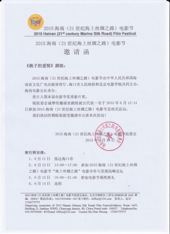 本公司出品的電影《桃子的愛情》成功入圍2015海南電影節(jié)