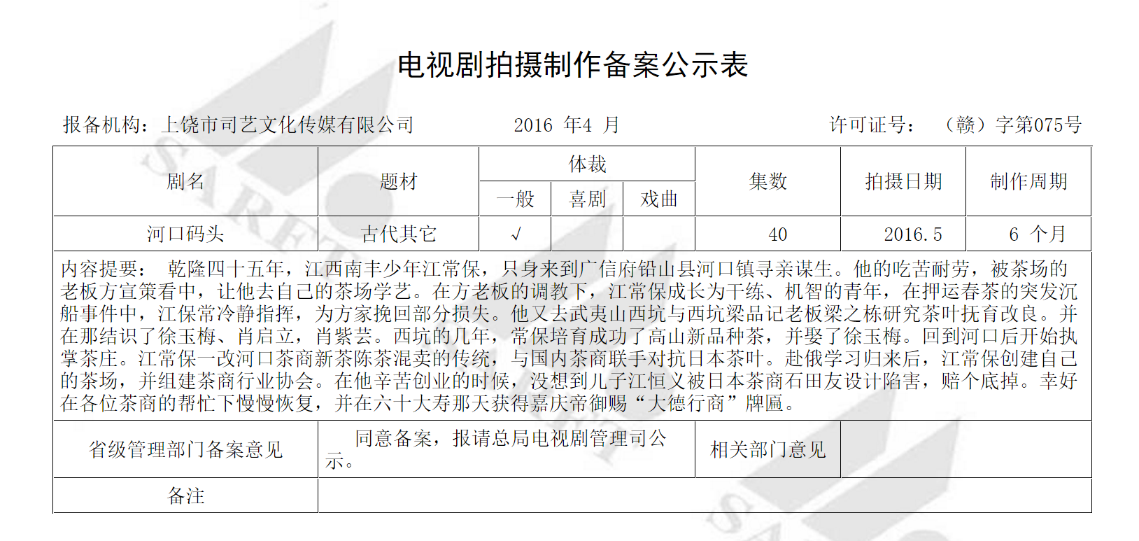 近日,在廣電總局4月公示名單中,本公司作品年代商戰(zhàn)電視劇《河口碼頭》在列。該劇主要通過一位河口茶販人生的起伏經(jīng)歷來體現(xiàn)當年河口碼頭地區(qū)的繁榮,再現(xiàn)千里茶道的輝煌。